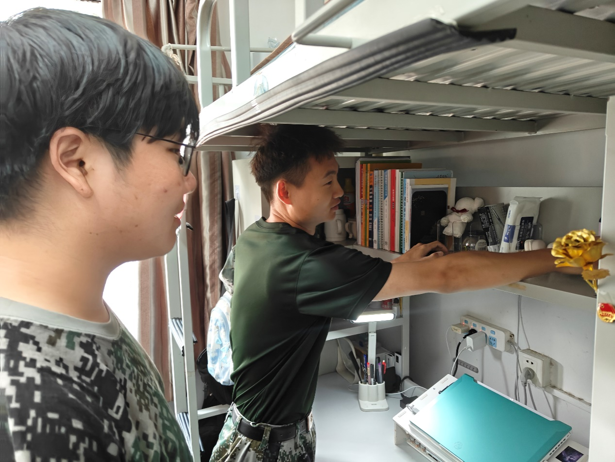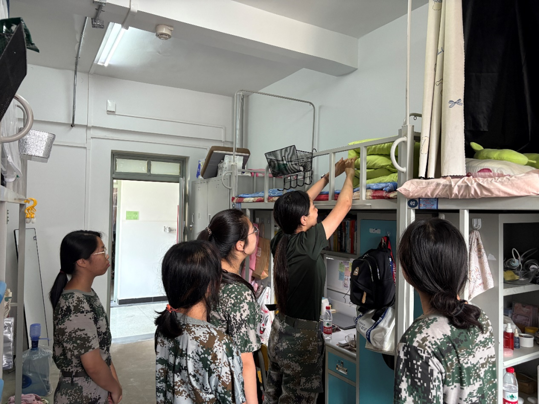 “豆腐块” 被子是军训内务的标志性成果,教官认真耐心地示范,同学们也纷纷拿出看家本领,将被子反复折叠、按压、塑形,原本松软的被子在他们手中逐渐变得方方正正、棱角分明。物品摆放区,牙缸、毛巾、书本等物品被整齐划一地排列,宛如列队的士兵。大家用严谨细致的态度对待每一个细节,诠释着 “细节决定成败” 的真谛,展现出良好的生活素养和集体荣誉感。